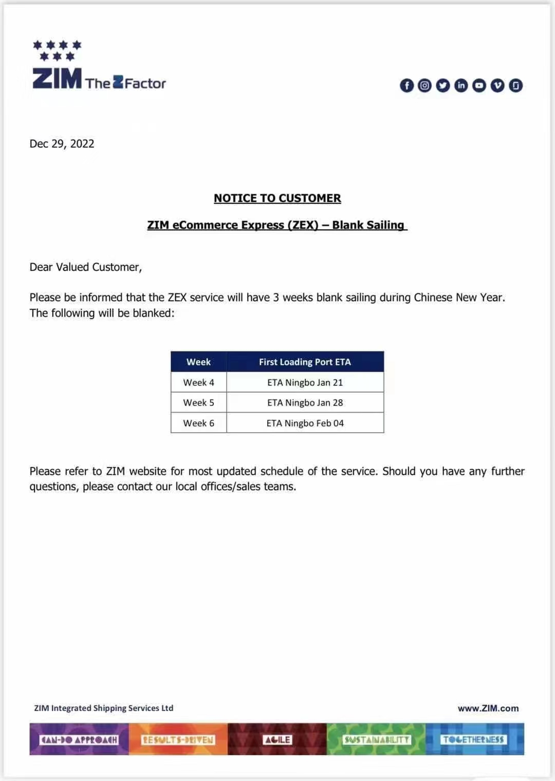 ZIM will be closed for 3 weeks during Chinese New Year (January 21, 28 and February 4)